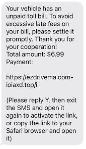 - Sample Text: “EZDriveMA: Your vehicle has an unpaid toll bill of $6.99. Pay now to avoid late fees: [fake link].”